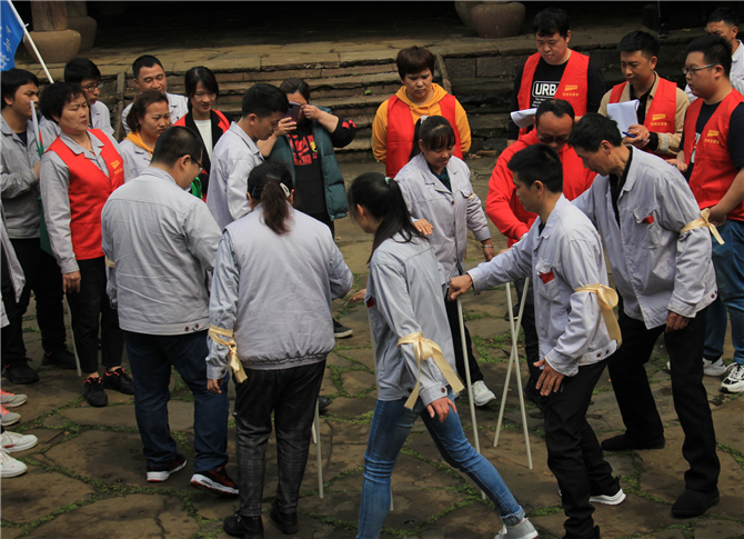 (不倒森林) 團隊成員圍成圈手握長桿垂直于地面,小組成員依次移動交換位置,長桿立于不倒,輪換完三遍,以用時最少為勝。